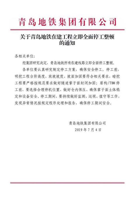 2019年7月5日上午,据不愿透露姓名的青岛地铁内部人士对界面新闻透露,青岛地铁集团昨天通过内网下发了《关于青岛地铁在建工程立即全面停工整顿的通知》,明确青岛地铁所有在建线路立即全面停工整顿。
