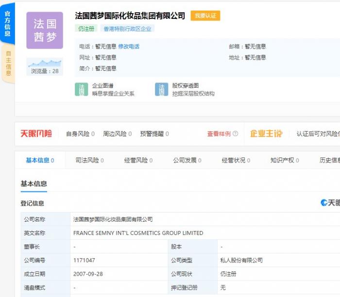 但据企查查公开资料显示,这家“法国茜梦国际化妆品集团有限公司”于2007年9月28日才成立,而且状态为仍在注册中的香港企业,难道又是一家假洋鬼子?