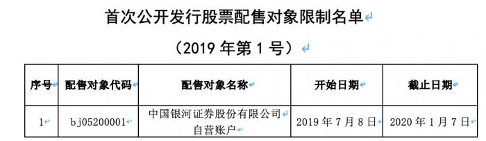 7月5日证券业协会发布《首次公开发行股票配售对象限制名单公告》,根据《科创板首次公开发行股票网下投资者管理细则》的规定,决定对在科创板“天准科技”新股发行项目网下申购过程中,存在违反《科创板首次公开发行股票承销业务规范》第十五条、十六条规定的股票配售对象列入限制名单。名单仅有银河证券自营账户,7月8日开始限制,直至2020年1月7日。