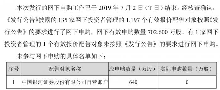 据了解,4日科创板企业天准科技公告网下初步配售结果,135家网下投资者管理的1197个有效报价配售对象按照要求进行了网下申购,网下有效申购数量702,600 万股,仅有银河证券的自营账户应申购640万股,但实际上未进行申购。