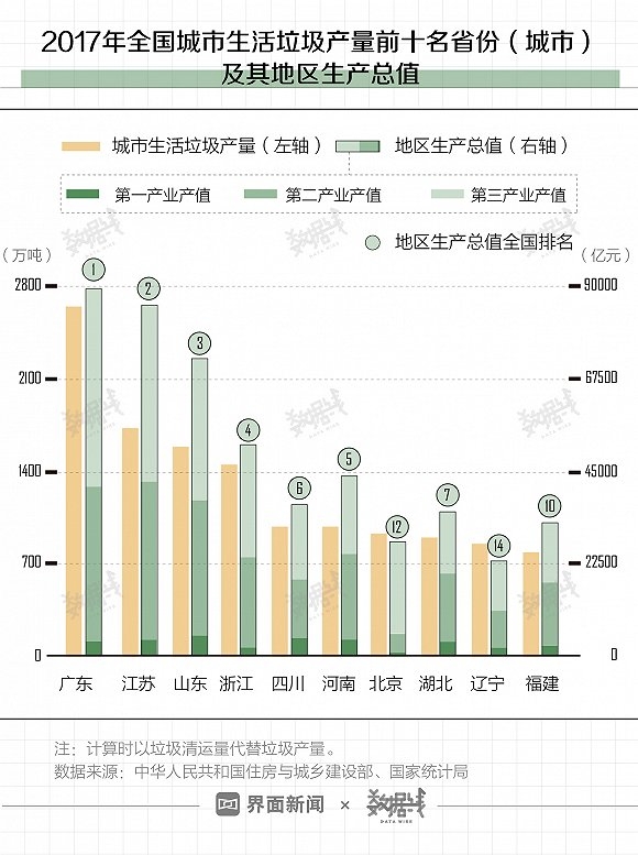 以2017年为例,广东、江苏、山东等经济强省的城市生活垃圾产量都相对较多。但总体而言,全国城市生活垃圾产量前十名城市排名,和当年全国地区生产总值排名并非一一对应。