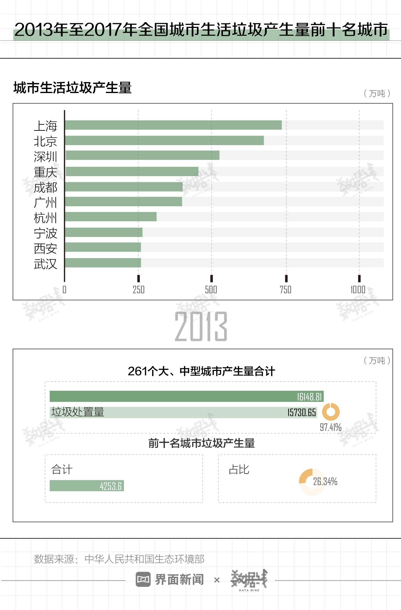 具体到城市方面,住房和城乡建设部自2014年开始发布全国大、中型城市生活垃圾产生量数据。2013年至2017年间,北京和上海轮流占据城市生活垃圾产量第一名。广州、深圳、重庆、成都等经济强市均为前十名常客。