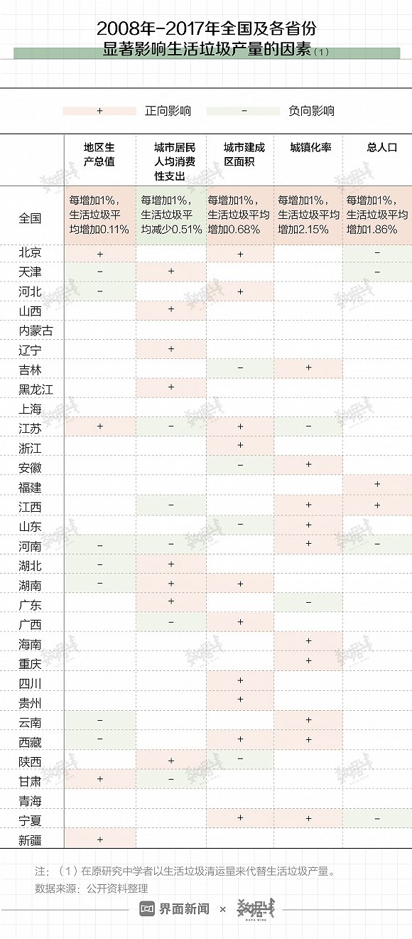 根据中国人民大学李漱玉和北京建筑大学杨璐明两位学者的最新研究,城市生活垃圾的产量和多个因素都有密切关系。就全国而言,GDP、城市建成区、城镇化率每增加1%,生活垃圾产量平均增加0.11%、0.68%、2.15%;居民消费性支出每增加1%,生活垃圾产量平均降低0.51%。