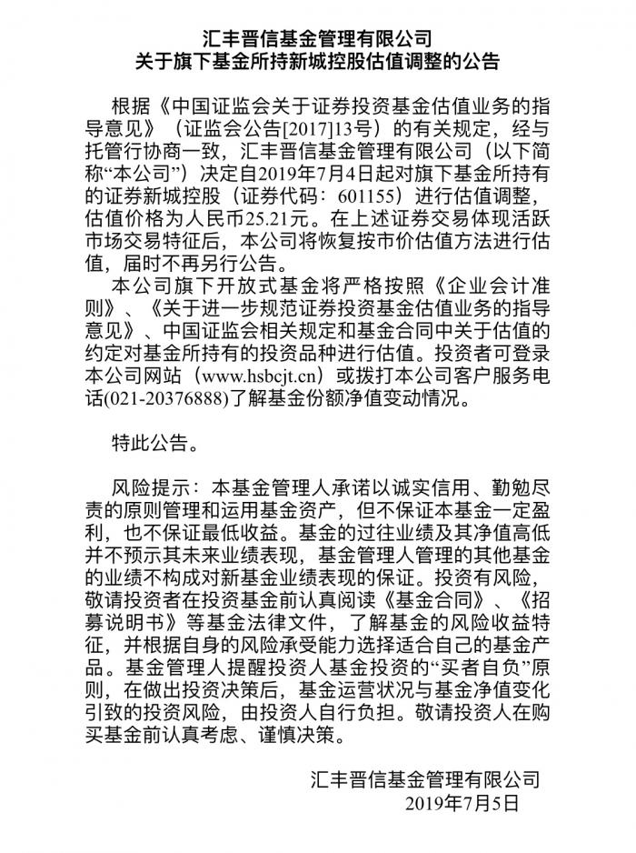 根据《中国证监会关于证券投资基金估值业务的指导意见》(证监会公告[2017]13号)的有关规定,经与托管行协商一致,汇丰晋信基金管理有限公司(以下简称“本公司”)决定自2019年7月4日起对旗下基金所持有的证券新城控股(证券代码:601155)进行估值调整,估值价格为人民币25.21元。在上述证券交易体现活跃市场交易特征后,本公司将恢复按市价估值方法进行估值,届时不再另行公告。
