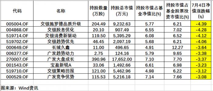 若从一季末所有重仓新城控股的主动权益基金来看,还有多只基金7月4日跌幅在4%以上,且均是交银施罗德旗下产品,以下是7月4日跌幅居前的相关基金: