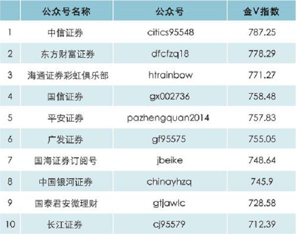此次证券榜变化较大,但中信证券在榜单中的位置巍然不动。以787.25的金V指数占据榜首。东方财富证券后来居上夺得榜眼,海通证券彩虹俱乐部也成功挤进前三。