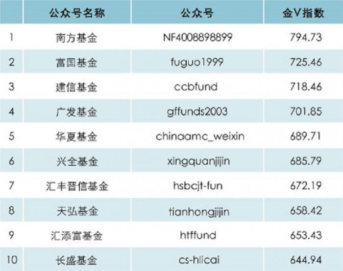基金榜变化幅度不大,分别占据上期榜单2、3、4名的南方基金、富国基金和建信基金都上升了一名,其中,南方基金以794.73的金V指数雄踞榜首。