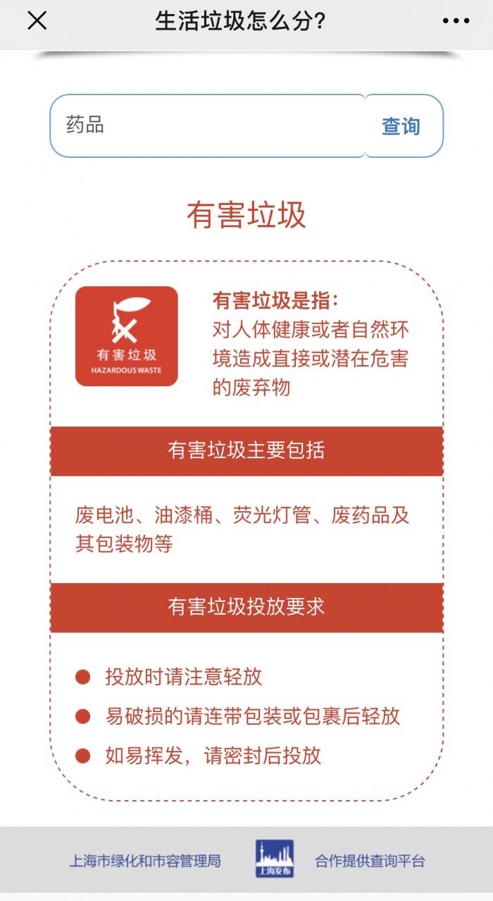 21新健康记者查询的第一个渠道是上海发布官方的垃圾分类查询,药品、废弃药品都属于“有害垃圾”一项。