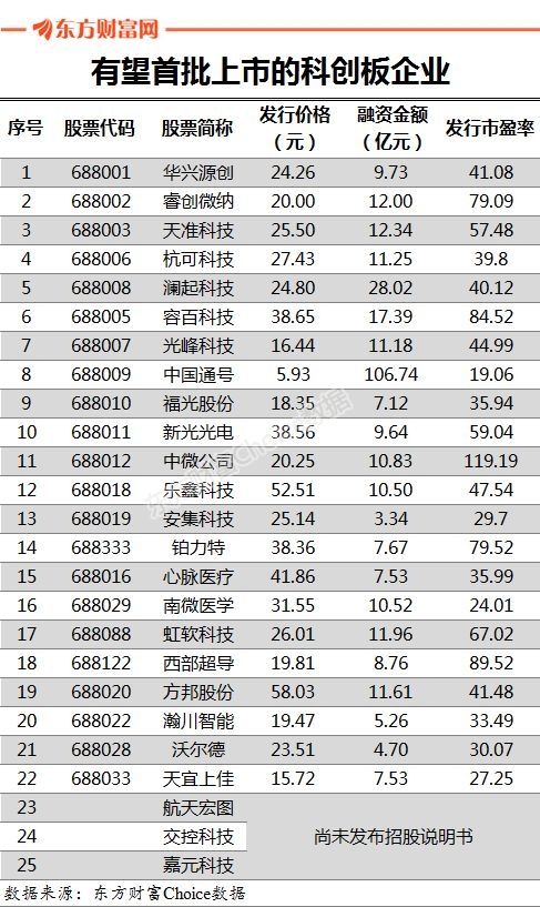 据报道,截至目前已获得证监会同意注册批复的25家公司,确定为科创板首批挂牌上市的公司。这25家企业中,有22家已经发布招股说明书,预计筹集资金325.6亿元,另有三家预计也将很快发布招股说明书。