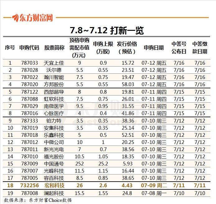 为此,近期科创板新股发行密集。7月8日至7月12日,每天都有新股可打,周一至周五的新股数量分别为1只、1只、9只、4只、4只,共19只新股。其中周二为1只沪市主板新股,其余18只均为科创板新股。