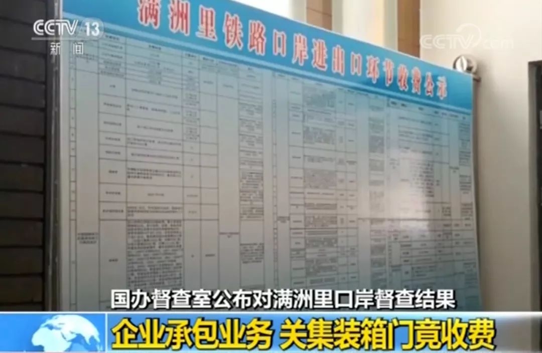 铁路运输是中国与俄罗斯进出口货物的主要运输方式。在满洲里火车站联检大楼三楼的一面墙上,公示了57种铁路口岸进出口环节收费项目。其中有一类是外贸企业应向铁路缴纳的集装箱装卸搬运,以及与货物查验相关的费用,包括吊装费、平移费、掏箱费等,每箱总计收费1128.8元。