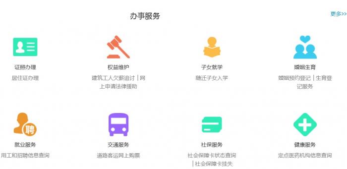 其中如“居住证办理”、“建筑工人欠薪追讨”“流动人员随迁子女入学”等过去农民工的热点需求,都可以实现在互联网上办理。