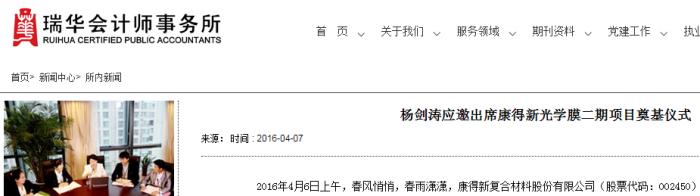 2016年4月6日,康得新光学膜二期项目奠基仪式上,公司董事长钟玉表示,康得新多元化、国际化布局的加快,需要会计师事务所等专业机构提供全方位的支持和帮助,共同成长。