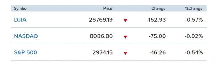 当地时间周一,美股开盘下挫,受苹果股价下跌拖累,科技板块表现欠佳。截至记者发稿,道琼斯工业指数下跌0.57%,报26769.19点;标普500指数跌0.54%,报2974.15点;纳斯达克指数跌0.92%,报8086.80点。