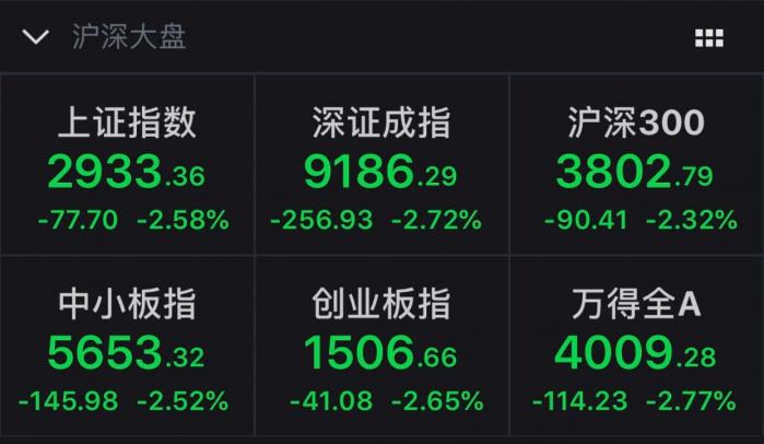 今日,三大股指均低开,随后一路走低。午后,大盘成横盘整理态势。截至收盘,上证指数报收2933.36点,跌幅2.58%,再度跌破3000点。