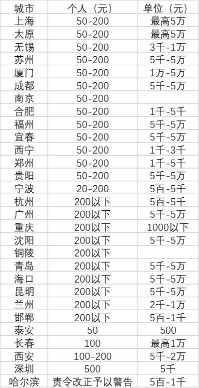 例如,宁波进一步规定,对情节严重的个人,处以200元以上500元以下罚款; 深圳和厦门的处罚最重:分别对情节严重和拒不改正的个人,处罚1000元。