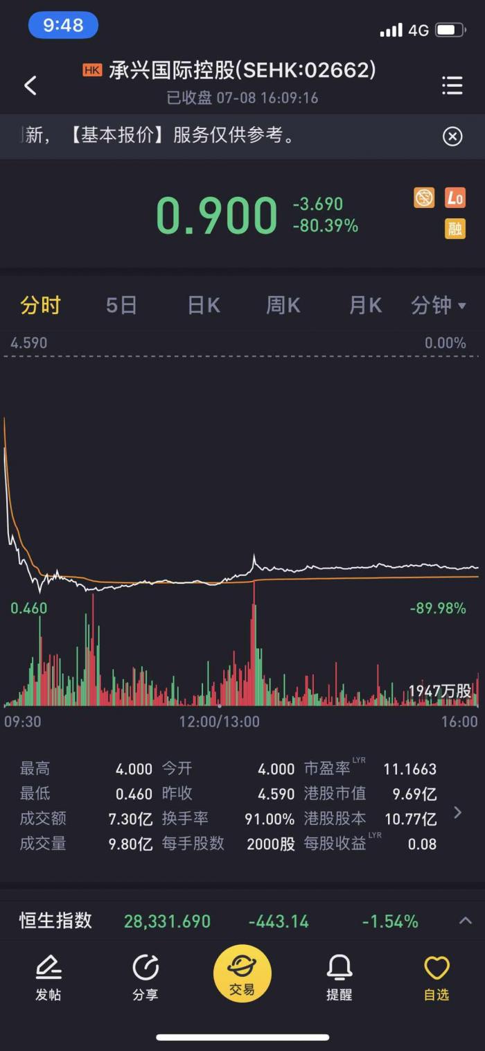 承兴国际(02662,HK)为港股上市公司。7月5日,承兴国际控股披露,公司董事会主席兼执行董事罗静被刑事拘留。受此影响,7月8日当天,承兴国际开盘后股价暴跌90%。