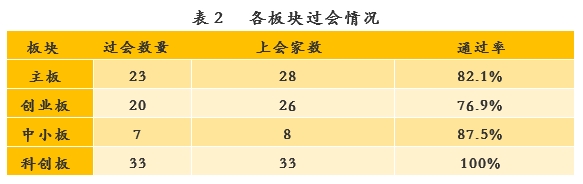 2019年主板有23家企业实现IPO,2家未通过,3家暂缓表决、待表决,过会率为82.1%;创业板有20家企业成功过会,6家未通过,过会率为76.9%;中小板仅有7家企业过会,1家未通过,过会率达87.5%;科创板全部成功过会,共有33家企业,通过数量和上会数量皆为四个板块最高。