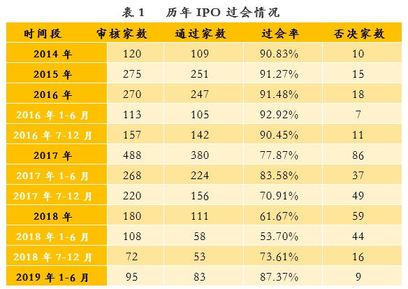 2019年上半年,证监会共计审核企业93家,较18年下半年增加29%。其中81家企业过会,9家被否,3家暂缓表决,过会率达87.09%,超18年下半年过会率13.49%。在18年IPO严审常态化之后,19年上半年过会率大增。