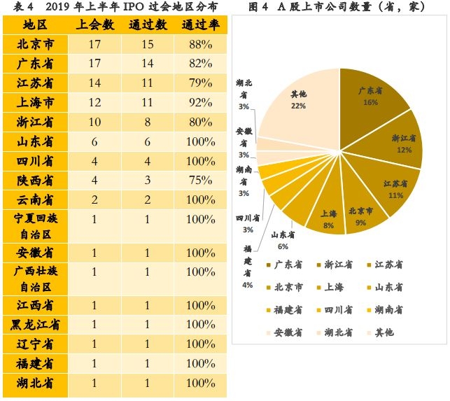 2019年上半年A股IPO分布在全国17个省市自治区,以北京、广东和江浙沪为主。从IPO上会家数来看,北京市、广东省最多为17家,江苏省和上海省紧随其后,分别有14家和12家。从IPO过会企业家数来看,北京市以15家居首位;广东省其次,为14家。山东省作为有多家上市公司的“A股IPO企业大省”,今年上半年上会数仅有6家,但6家企业全部成功过会。江苏省虽有11家企业IPO上会,但其过会率仅为79%。