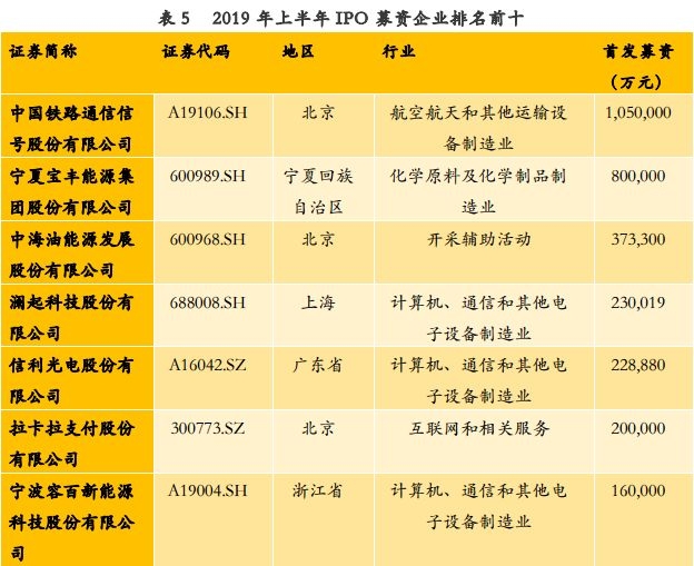 3、2019年上半年企业IPO募资情况(按上市日)
