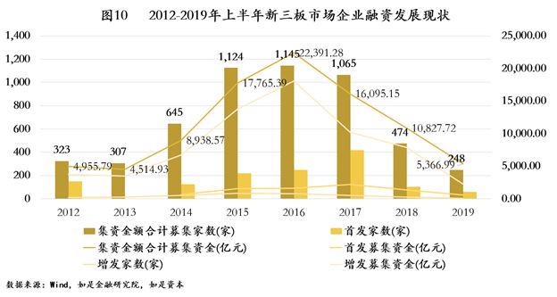 新三板市场自2012年扩容全国发展至2017年,企业挂牌数量及定增融资额实现快速上涨。2015-2017年,平均每年可实现1300亿以上的股权定增融资。但进入2018年后,企业挂牌数量及定增融资额都出现了明显的下滑,19年上半年募集资金和企业家数都未能回暖。