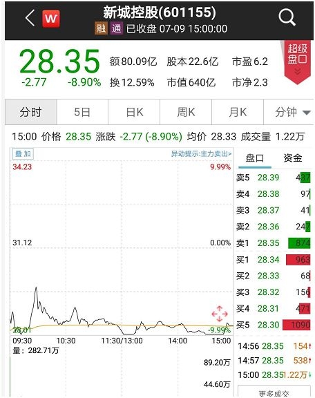 几天前市值还逼近千亿元的新城控股,在连续3天的一字跌停后,迎来抄底资金,盘中打开跌停。截至收盘,报28.35元,下跌8.90%。
