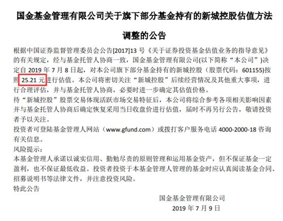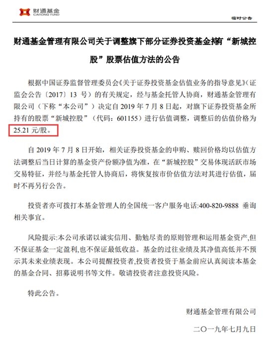 上述黑天鹅事件冲击下,众多基金公司下调新城控股的估值,其中不少对新城控股的最新估值为28.01元/股,这已和今天盘中的跌停价相当,另有不少基金将其估值下调为25.21元/股,即在目前的基础上,还有一个多跌停。如泰达宏利、财通基金、国金基金等基金均将新城控股的估值下调为25.21元/股。