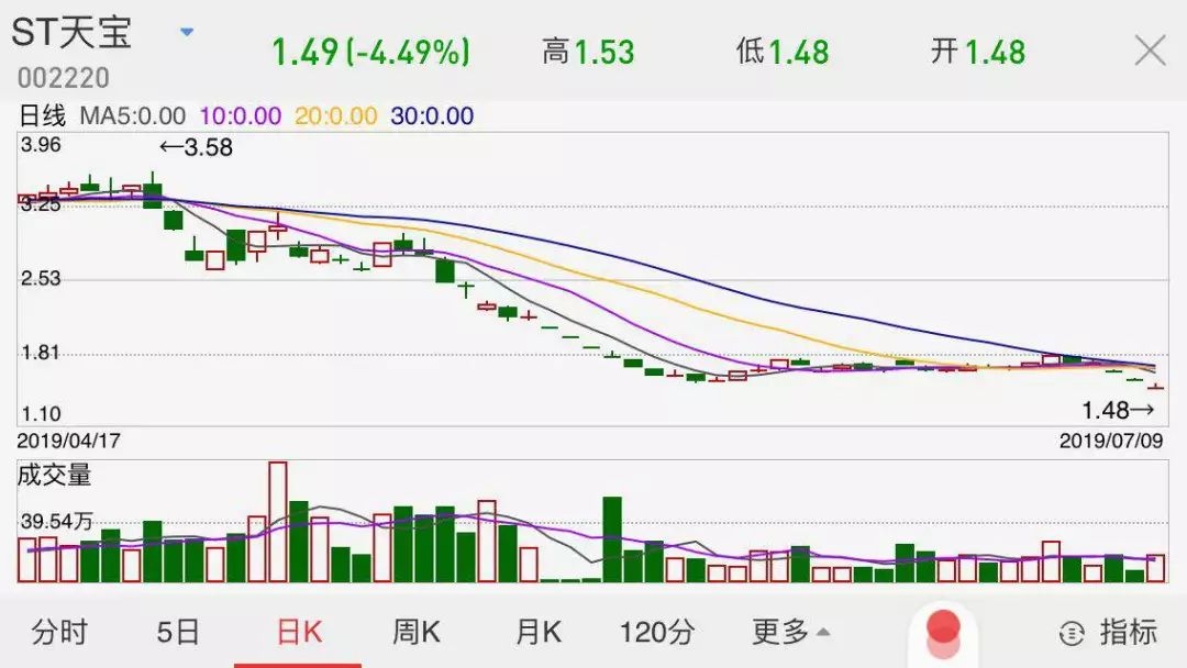 ST天宝7月4日晚公告称,公司董事长黄作庆及财务总监孙树玲被大连市公安局经侦支队因涉嫌虚开发票罪采取拘留的强制措施。随后的两个交易日ST天宝连续跌停,今日股价再度跌停。3个交易日市值蒸发1.8亿元,目前公司总市值11.3亿元。