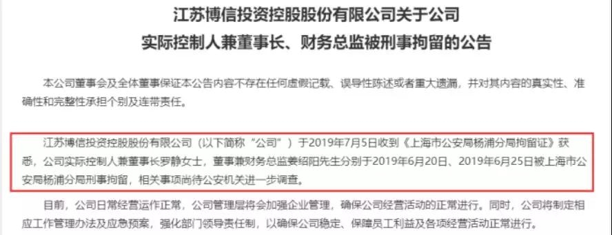 7月5日午间,博信股份公告称,江苏博信投资控股股份有限公司于2019年7月5日收到《上海市公安局杨浦分局拘留证》获悉,公司实际控制人兼董事长罗静女士,董事兼财务总监姜绍阳先生分别于2019年6月20日、2019年6月25日被上海市公安局杨浦分局刑事拘留,相关事项尚待公安机关进一步调查。