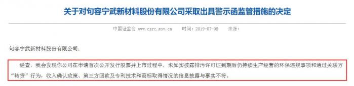 句容宁武新材料则是因为未如实披露排污许可证到期后仍持续生产经营的环保违规事项和通过关联方“转贷”行为,收入确认政策、第三方回款及专利技术和商标取得情况的信息披露与事实不符。