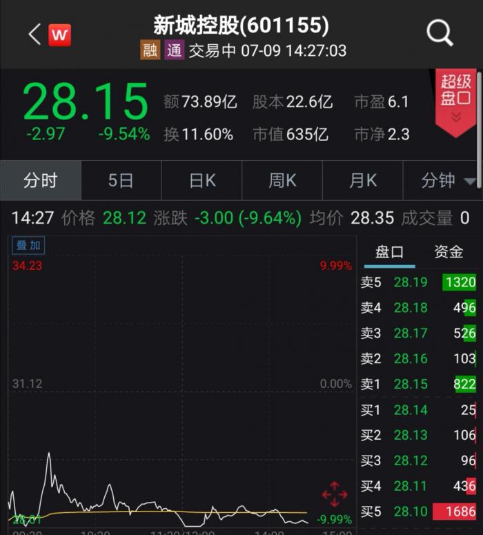 继7月4日、5日、8日连续三个交易日跌停后,7月9日,新城控股打开跌停板,截至发稿,下跌9.54%,报28.35元。
