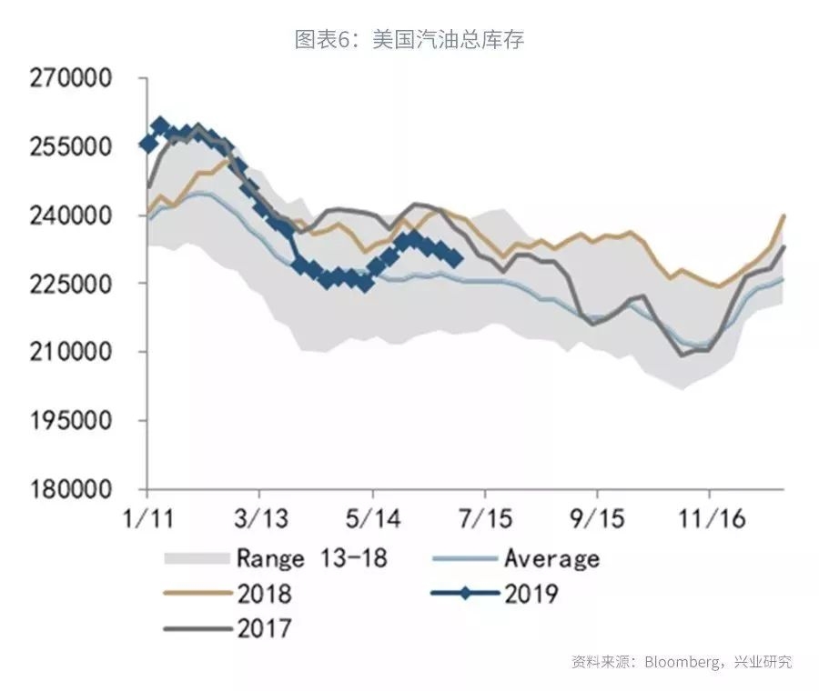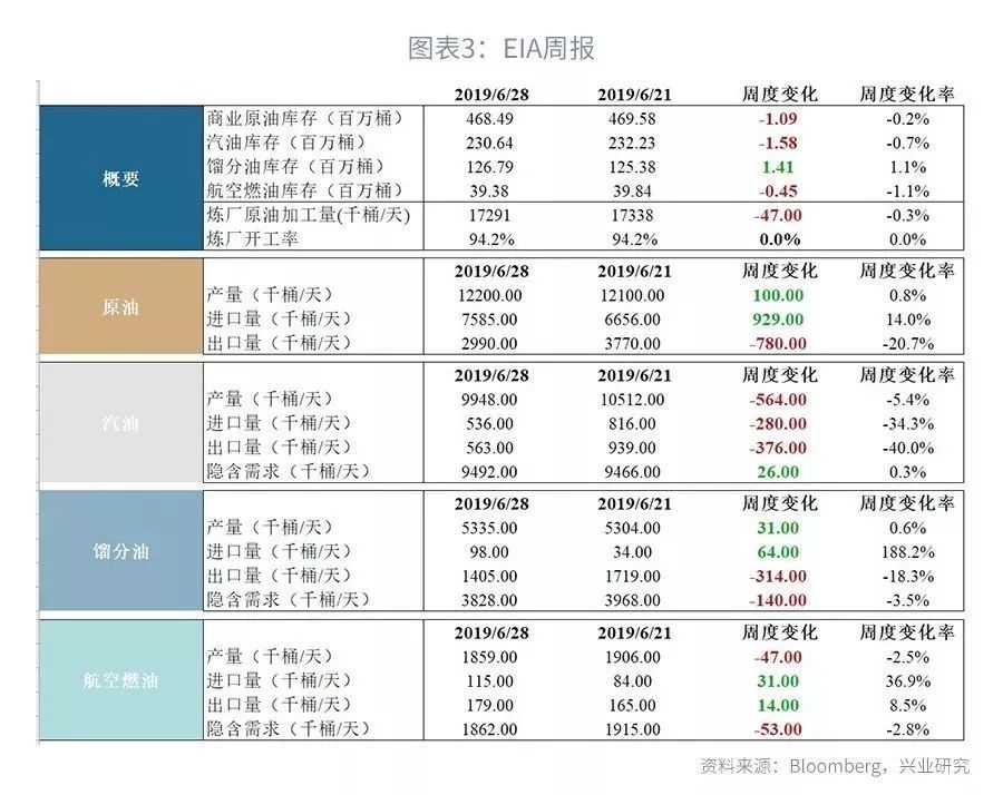 本周三公布的截至6月28日的EIA库存数据显示,美国原油库存减少109万桶至4.6849亿桶,预期减少279万桶,前值减少1278.8万桶。修正项上调是本周原油库存降幅不及预期的主要原因。汽油库存减少158万桶至2.3064亿桶,馏分油库存增加141万桶至1.2679亿桶,预期减少116.4万桶,前值减少244.1万桶。进出口方面,本周原油进口量增加92.9万桶/天至758.4万桶/天,环比上升14%,原油出口量减少78万桶/天至299万桶/天。汽油进口量减少28万桶/天至53.6万桶/天,汽油出口量减少37.6万桶/天至56.3万桶/天。需求方面,汽油需求环比增加2.6万桶/天;馏分油需求环比减少14万桶/天,航空燃油需求环比减少5.3万桶/天。
