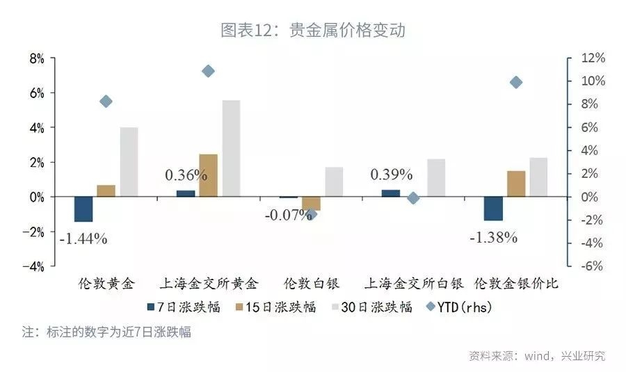 走势回顾:本周伦敦金下跌1.44%,金交所黄金涨幅0.36%;伦敦银下跌0.07%,金交所白银涨幅0.39%。