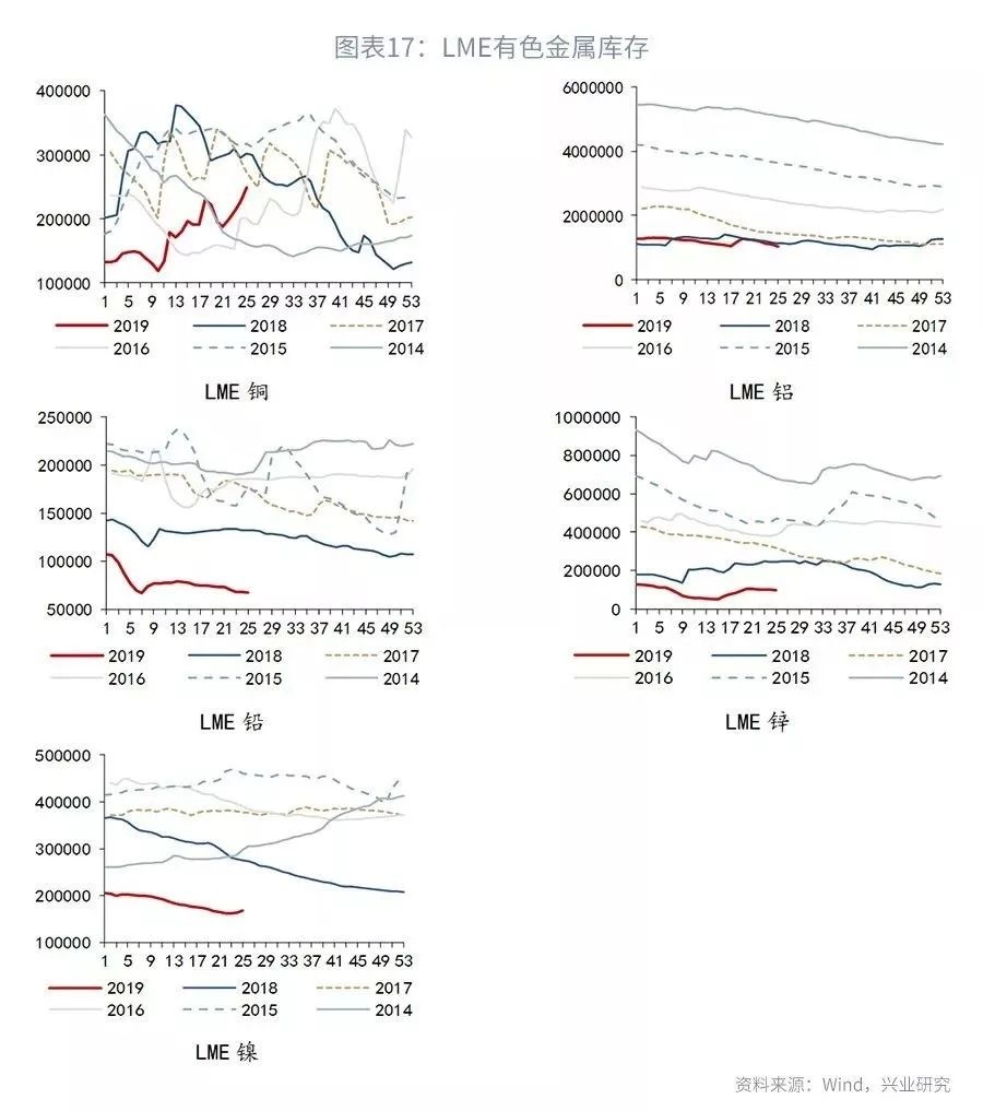 本周期铝价格先抑后扬。周初因美元指数走强,海外海德鲁氧化铝稳步复产而铝价承压,但LME铝库存跌至五年同期最低水平,伦铝触底反弹并录得三连阳。