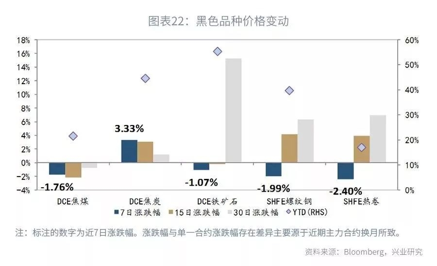 走势回顾:本周焦炭期货主力合约周度涨幅3.33%,铁矿石期货主力合约周度跌幅1.07%,螺纹期货主力合约周度跌幅1.99%,焦煤期货主力合约周度跌幅1.76%,热卷期货主力合约跌幅2.40%。
