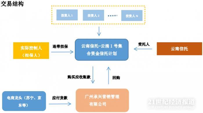 21世纪经济报道梳理公开信息发现,至少8家资管机构和第三方财富管理机构曾经为承兴国际融资,包括信托、券商资管和私募基金。而京东和苏宁方面均对记者表示,在多个融资项目中作为第一还款来源的他们,对此事并不知情,京东甚至认为承兴涉嫌伪造与京东等公司的合同进行诈骗。