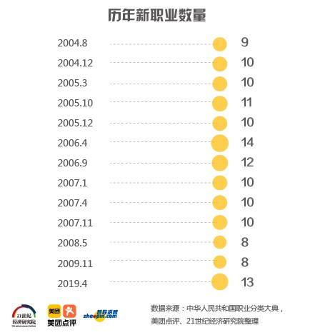 从2004年发布新职业名单工作开始至2009年,我国累计发布了12批次122个新职业,2010年至2018年未发布新职业。2019年4月发布的13个新职业是2015版《中华人民共和国职业分类大典》修订后发布的首批次新职业。近年来,随着经济社会发展、科技进步和产业结构调整,我国新产业新业态新模式不断涌现。互联网、人工智能、物联网、大数据、云计算等新兴技术得到广泛运用,在加快传统服务业数字化升级改造的同时,还为新兴职业的涌现提供了客观基础。在此背景下,界定新职业、持续更新职业名单、引导和支持新职业的发展,成为一项紧迫的任务。
