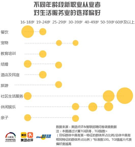 生活服务行业不仅是初入职场者的就业选择,也为工作经验丰富的从业者提供了就业机会。根据对不同年龄段新职业从业者的行业选择偏好TGI分析得出,如洗浴汗蒸、足疗按摩、洗涤维修、家政保洁等集中的休闲娱乐、社区生活服务等行业吸纳了很多40岁以上的从业者。