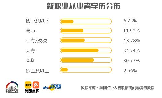 本次调研数据显示,七成新职业从业者为大专及以下学历。新职业成为高职院校、大专院校毕业生的就业蓄水池。生活服务业相对通畅的就业机会和较稳定的收入来源为那些拥有一技之长、教育程度中等的年轻人提供了学以致用的空间。