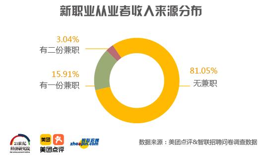 与每天朝九晚五坐办公室的上班族相比,新职业从业者的工作时间相对来说更加灵活,这意味着他们可以有一份甚至多份兼职收入。本次调研数据显示,接近二成的新职业从业者有一份及以上兼职,这也与大多数青年的工作状态相符。据《新时代新青年:2019青年群体观察》显示,斜杠青年成当代青年标配,29%的青年有兼职工作,收入来源多元。兼职选择中,新媒体从业人员占5%,设计人员占4%,司机代驾占3%,微商代购占1.4%,快递骑手占1.3%。《报告》集中调研了兼职集中的民宿房东,数据显示,民宿房东中兼职群体占六成左右,最爱跨界开民宿的五类人群分别是:设计师、事业单位行政人员、自由职业者、学生、教师。