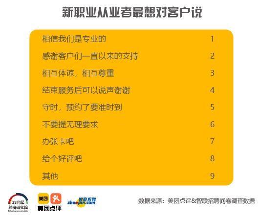 基于回收的9784份有效问卷以及美团点评、智联招聘平台数据,同时结合对生活服务业重点行业从业人员的访谈,美团点评与21世纪经济研究院、智联招聘联合撰写了《2019年生活服务业新职业人群报告》(以下简称《报告》)。《报告》通过分析我国生活服务业新职业的发展背景、发展现状和典型案例,对生活服务业新职业人群进行画像,全方位反映生活服务业新职业人群的风貌,展现新经济蓬勃发展背景下生活服务业新职业人群的生活状态和社会价值,探寻新职业发展对稳就业和提高就业质量的作用。《报告》还分析了生活服务业新职业的发展趋势并提出了促进生活服务业新职业发展的相关政策建议。