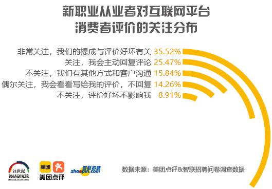 近年来,消费者评价已成为互联网生态的重要组成部分。本次调研数据显示,35.5%的新职业从业者非常关注美团、大众点评上的消费者评价,甚至作为绩效考核的参考标准,美团、大众点评上的消费者评价的好坏直接影响提成的额度;25.5%的新职业从业者会主动回复评价,与消费者互动,维护好客情关系。关注消费者评价有助于新职业从业者掌握消费者的真实需求和消费习惯,从而有针对性地提升服务质量,有效满足消费者的需求。