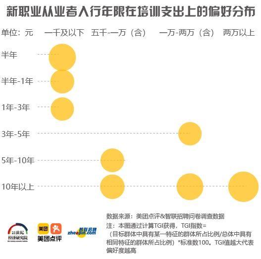 从新职业从业者的从业时间和职业培训支出的TGI偏好可以看出,随着从业时间的增加,新职业从业者在职业培训上的花费也增多。从业三年以下的新职业从业者偏好培训支出在1000元及以下,从业三到五年的新职业从业者偏好培训支出在10000-20000元(含),从业十年以上的新职业从业者偏好培训支出5000-20000元及以上。