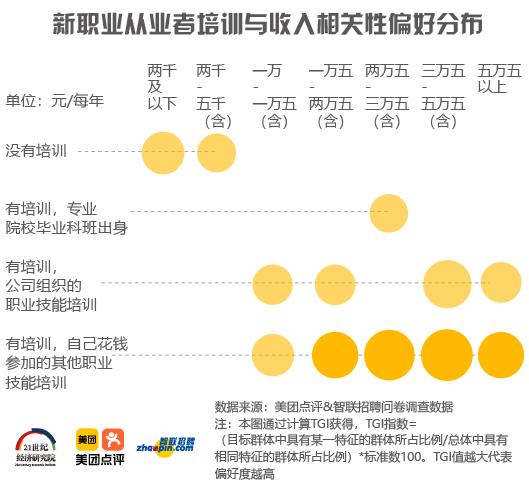 有投入就有回报。参加优质且针对性强的职业培训,是提升新职业从业者收入的重要渠道。职业培训或将成为助力新职业从业者职业通道上升的重要方式。TGI指数显示,培训投入与获得的收入直接相关。若新职业从业者没有参加过培训,月薪在2000元以下及2000-5000元(含)之间的分布更多;若参加过公司组织的职业技能培训,月薪在10000元以上的分布更高;若新职业从业者自费参加其他的职业技能培训,月薪在15000元以上的分布更高,且获得更高薪酬的可能性进一步加大。通过职业培训提升技能进而提升收入,收入提升后进一步加大对培训的投入,是新职业从业者提升自我的良性循环路径。