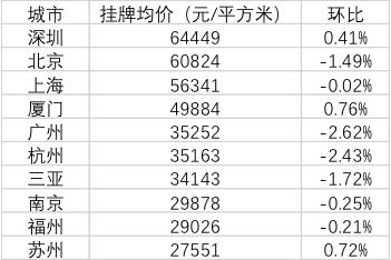 二手住宅挂牌均价前十名中,10个城市中仅有深圳、厦门、苏州3座热点城市二手房价格上涨,其余城市价格都呈下降状态。