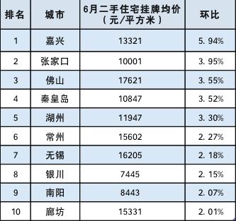 6月二手住宅挂牌均价环比涨幅前十名