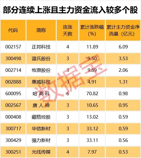 值得注意的是,60只连续上涨个股中,4只个股期间主力资金累计净流入超过亿元。其中,累计资金流入最多的为正邦科技,主力资金累计流入6.09亿元。