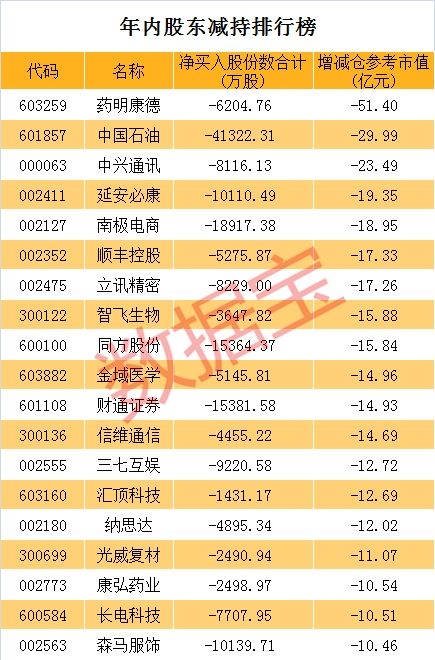 中国石油位居年内重要股东净减持金额榜单第二位,减持金额接近30亿元。中兴通讯位居第三位,股东净减持金额超过23亿元。延安必康、南极电商、顺丰控股等16股被股东净减持均超过10亿元,申通快递、美年健康、佳都科技等21股被股东净减持均超过5亿元。