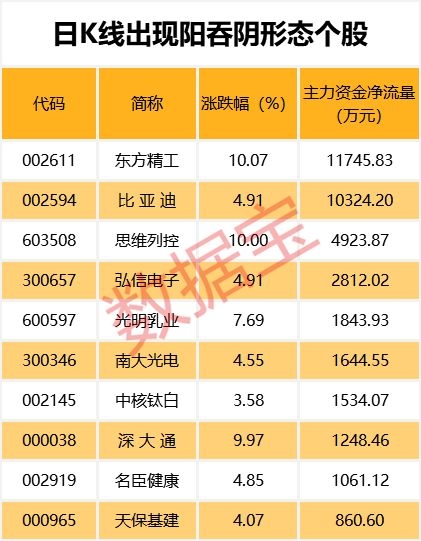 截至7月9日收盘,两市共有45只个股日K线出现阳吞阴形态,当天东方精工、思维列控、深大通等均以涨停收盘。值得注意的是,东方精工、比亚迪、思维列控等个股主力资金净流入最多,分别达到1.17亿元、1.03亿元、0.49亿元。
